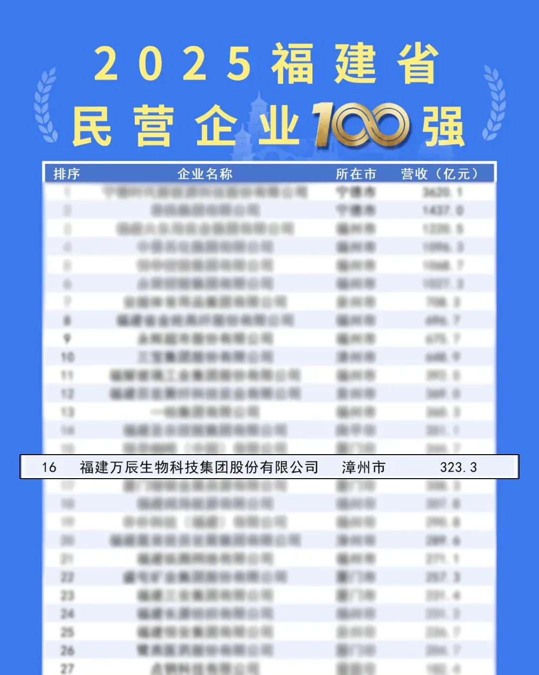 9月28日,2025福建省民營企業(yè)100強發(fā)布暨寧德市產(chǎn)業(yè)招商推介會在寧德舉行,會上福建省工商聯(lián)發(fā)布了2025福建省民營企業(yè)100強、制造業(yè)民營企業(yè)100強、服務(wù)業(yè)民營企業(yè)100強、創(chuàng)新型民營企業(yè)100強4個榜單。萬辰集團登榜,位列2025福建民營企業(yè)100強第16位、2025福建服務(wù)業(yè)民營企業(yè)100強第4位。